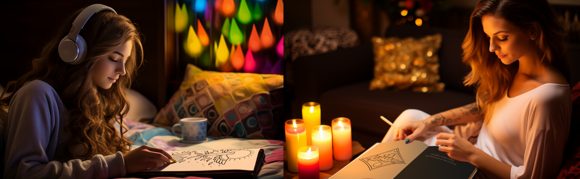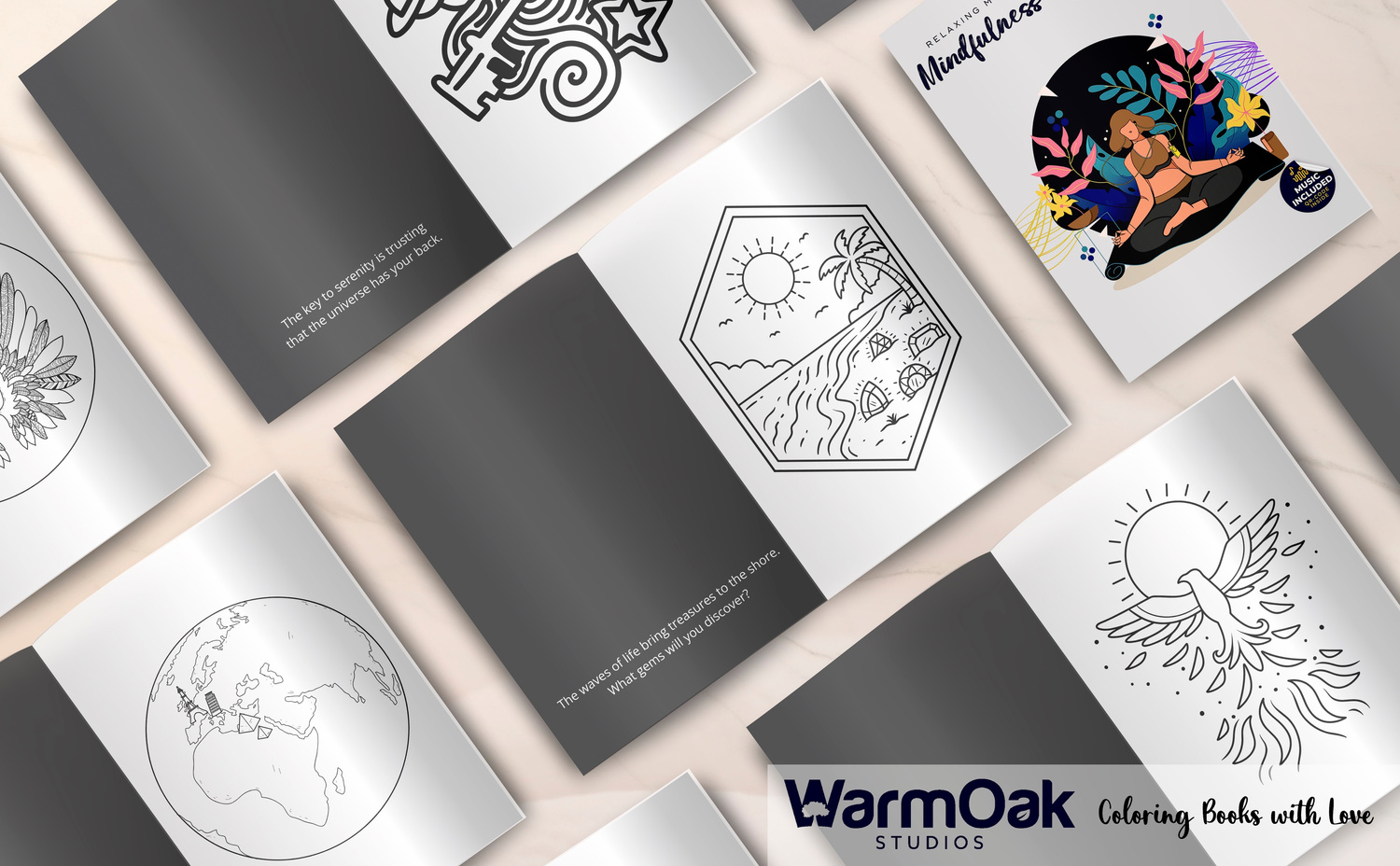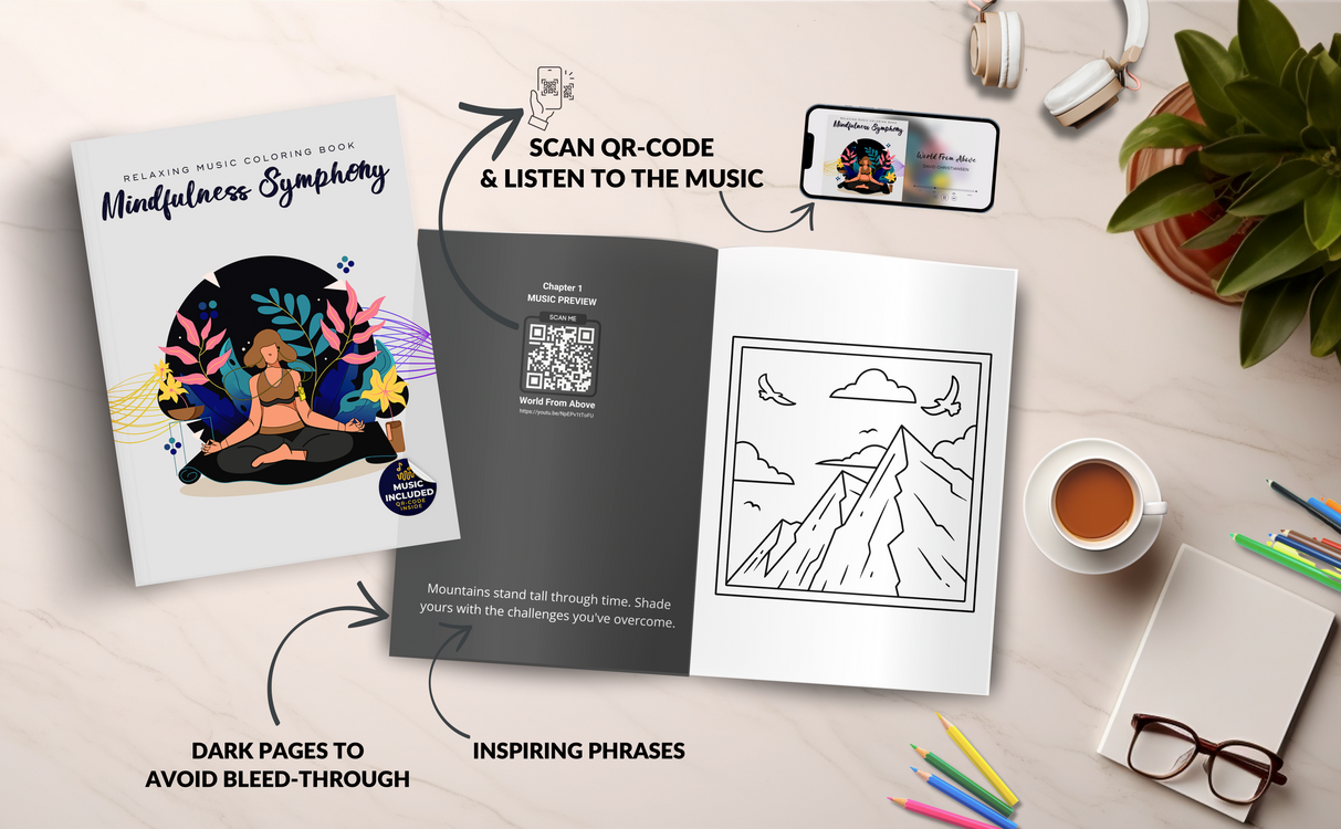 It features inspiring phrases in context with easy-to-color images, and a specially composed ambient soundtrack with elements recorded in one of the world's leading film scoring studios.