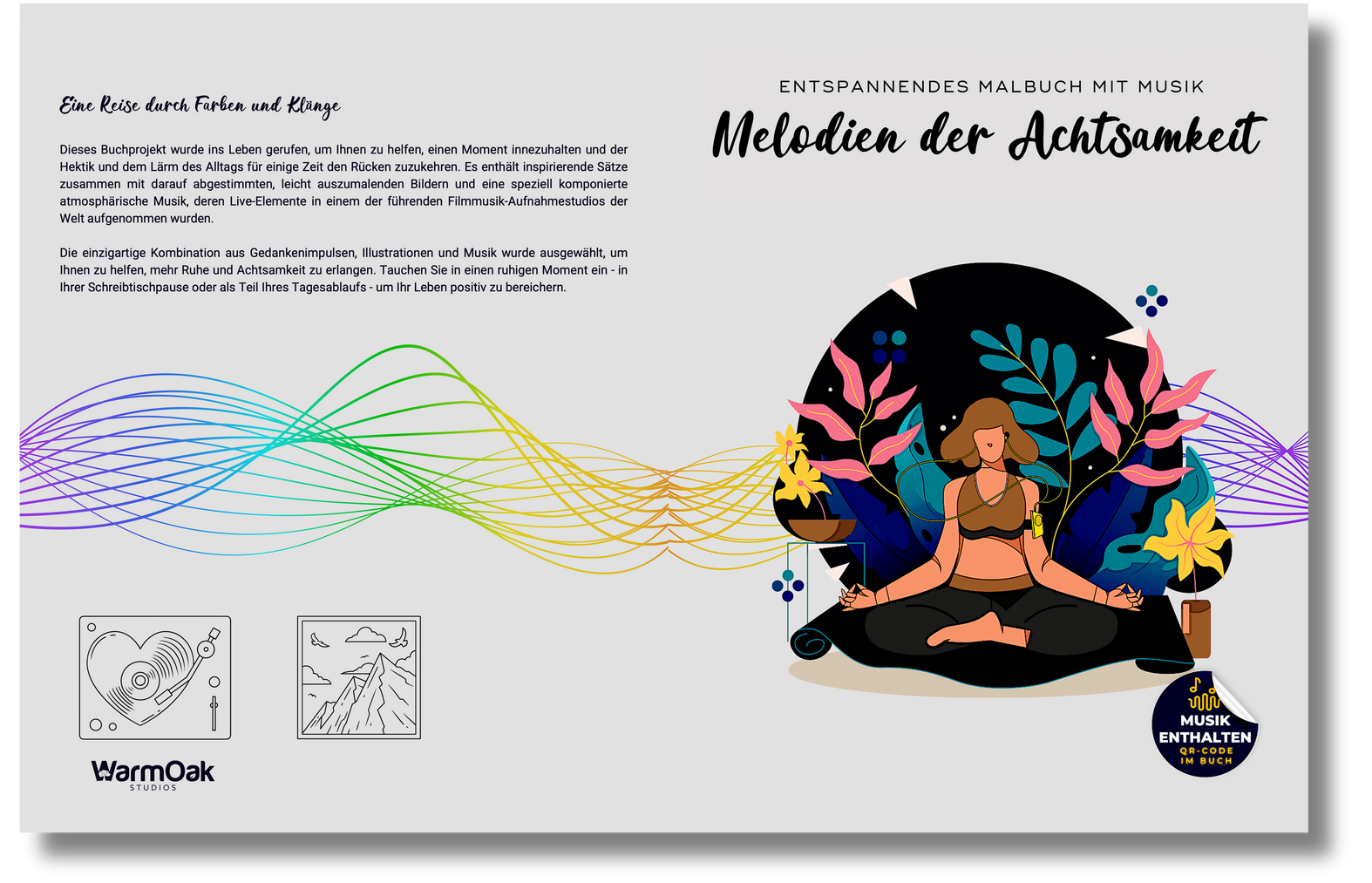 It features inspiring phrases in context with easy-to-color images, and a specially composed ambient soundtrack with elements recorded in one of the world's leading film scoring studios.